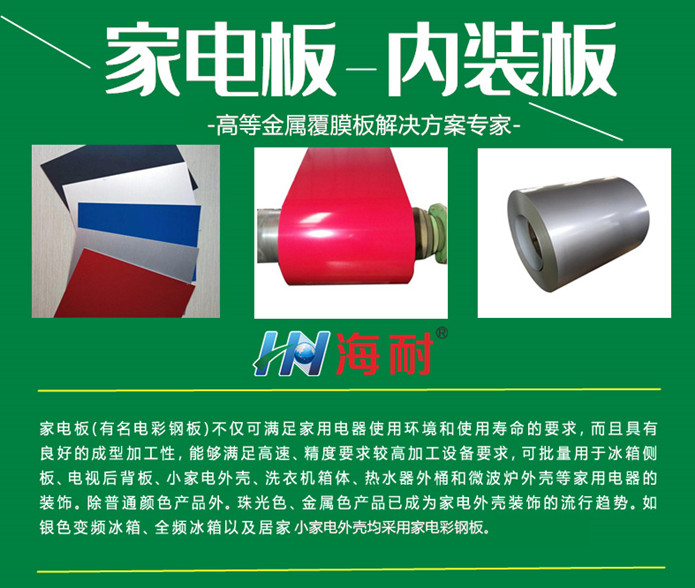 海耐家電彩鋼板是以熱鍍鋅鋼板、鍍鋁鋅鋼板、電鍍鋅板等為基板,經(jīng)表面化學(xué)轉(zhuǎn)化預(yù)處理之后,在表面熱帖一層或幾層的高分子膜,隨后經(jīng)過(guò)冷卻粘合固化而成的產(chǎn)品。也因覆有各種不同顏色的膜由此得名,也稱(chēng)彩鋁板(卷)。使用熱鍍鋅鋼板為基材的海耐家電彩鋼板、覆膜鋼板除有鋅層保護(hù)外,鋅層上的高分子膜起了覆蓋和保護(hù)作用,防止金屬基板生銹,使用壽命是傳統(tǒng)金屬板或彩涂板的約2-3倍。海耐家電彩鋼板(咨詢(xún):0510-83326008)具有輕質(zhì)、美觀和良好的防腐蝕性能,又可直接加工,顏色一般分為灰白、海藍(lán)、磚紅,灰色、木紋、石紋、拉絲板主要應(yīng)用于廣告業(yè)、建筑業(yè)、家電行業(yè)、電器行業(yè)、家具行業(yè)及化工容器罐體。海耐家電彩鋼板所用納米膜根據(jù)使用環(huán)境不同和客戶(hù)需求選擇合適的的材料,用戶(hù)可根據(jù)自身用途進(jìn)行針對(duì)性選擇表面膜的材質(zhì)。